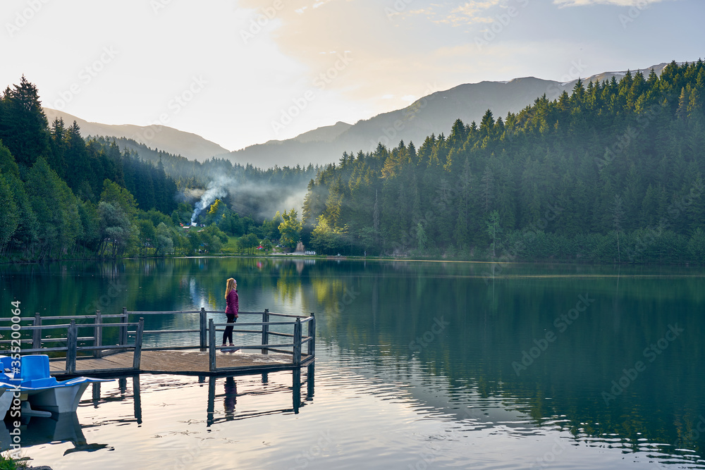 Blonde girl is standing and posing on the wooden dock near boats on the foggy lake Karagol. Landscape photo was taken in Savsat, Artvin, Black Sea / Karadeniz region of Turkey.