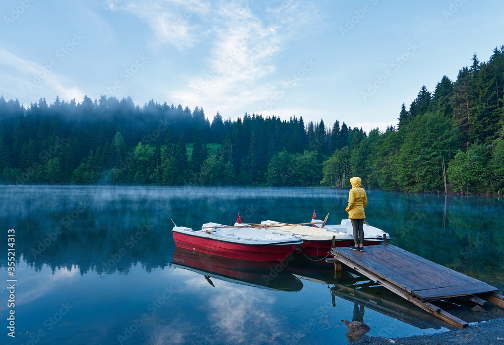 A girl in yellow coat is standing and posing on the wooden dock near boats on the foggy lake Karagol / Karagöl. Landscape taken in Savsat / Şavşat, Artvin, Black Sea / Karadeniz region of Turkey.
