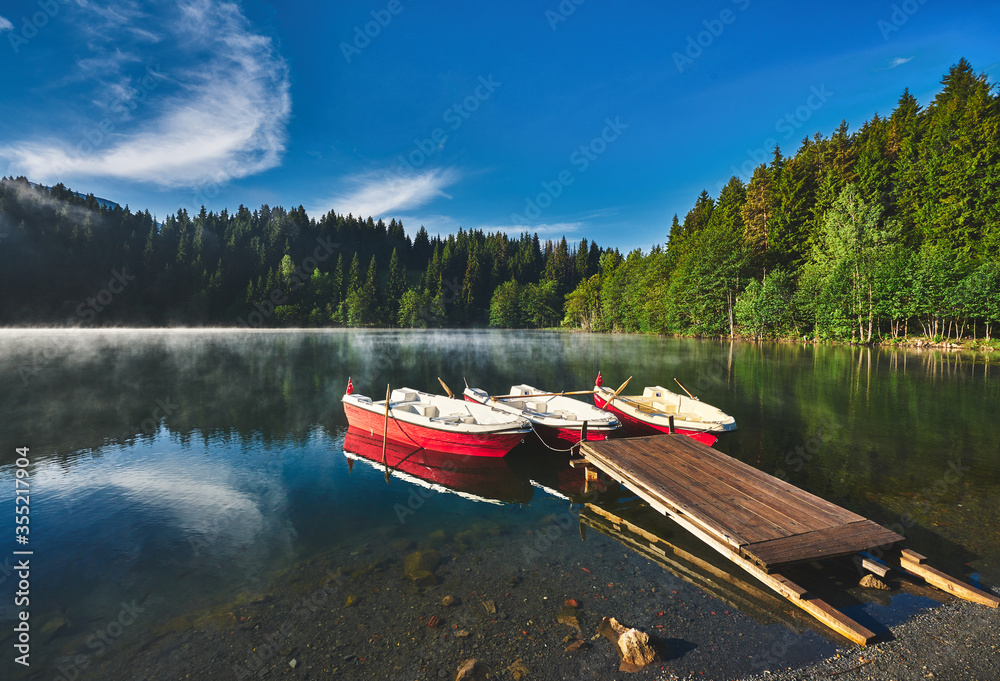 Beautiful landscape photo of Karagol / Karagöl Lake, surrounded by trees with boats on dock, Savsat / Şavşat, Artvin, Black Sea region of Turkey