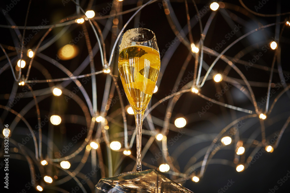 Elegant glass of champagne with orange zest on the background of a shining chandelier, a glass of sparkling wine on a blurred, luminous background, close-up, copy of the space