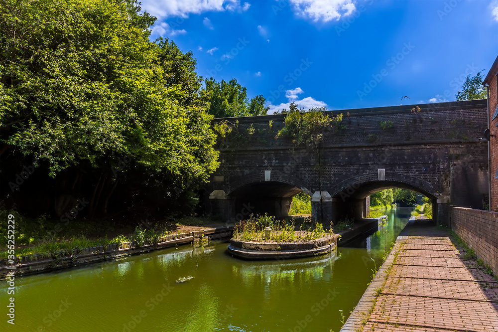 A view of a bridge carrying the Birmingham canal over the Dudley canal in summertime