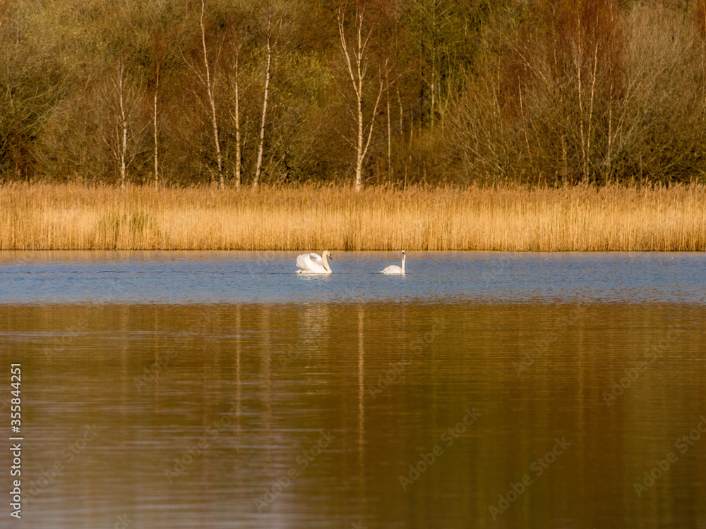 Male and female mute swans enjoying coutship dances in early springtime at Neumans flash lakes, Northwich, Knutsford, Cheshire, UK