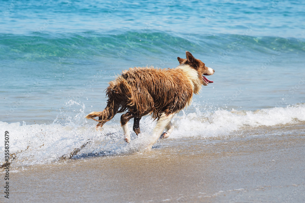 Happy Dog breed of Collie runs at high speed on the sandy beach.