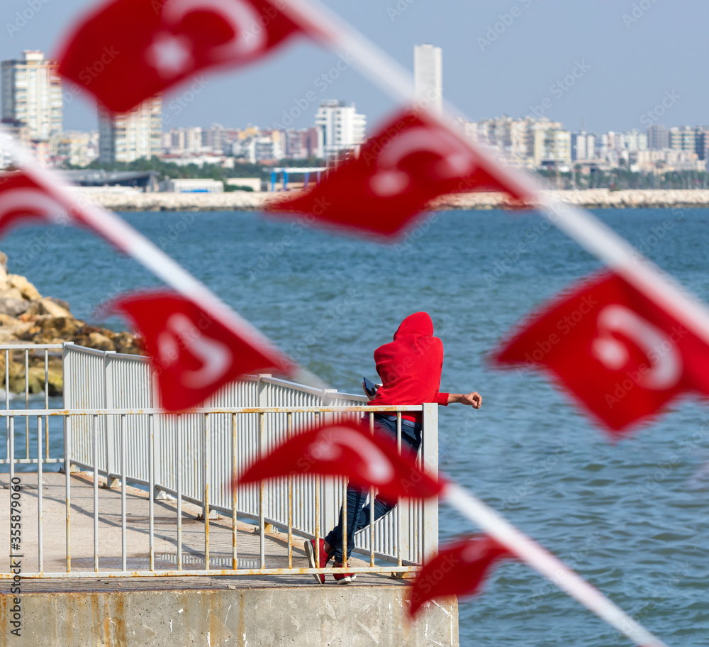 A young man is looking at the sea view at the Mersin/Turkey(Turkish flag)