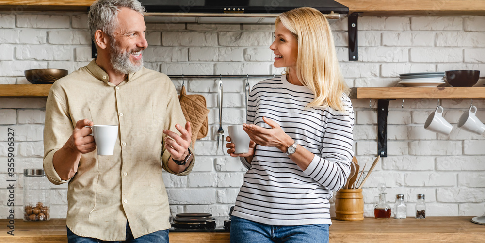 Cheerful middle aged couple talking on kitchen while drinking coffee