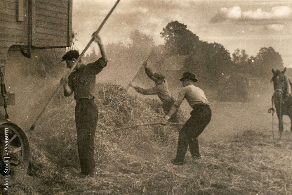 Latvia - CIRCA 1920s: Steam engine with thresher. Photo of farmers working on field. Archive vintage black and white photography