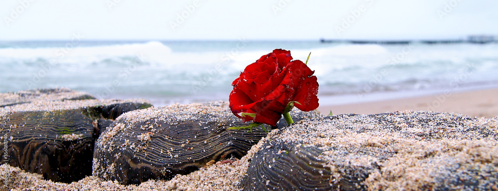 panoramic view of red rose lonely flower at beach, water background, copy space, burial at sea. Funeral flower symbol and Covid-19 Condolence card concept. Outbreak of corona virus pandemic disease.