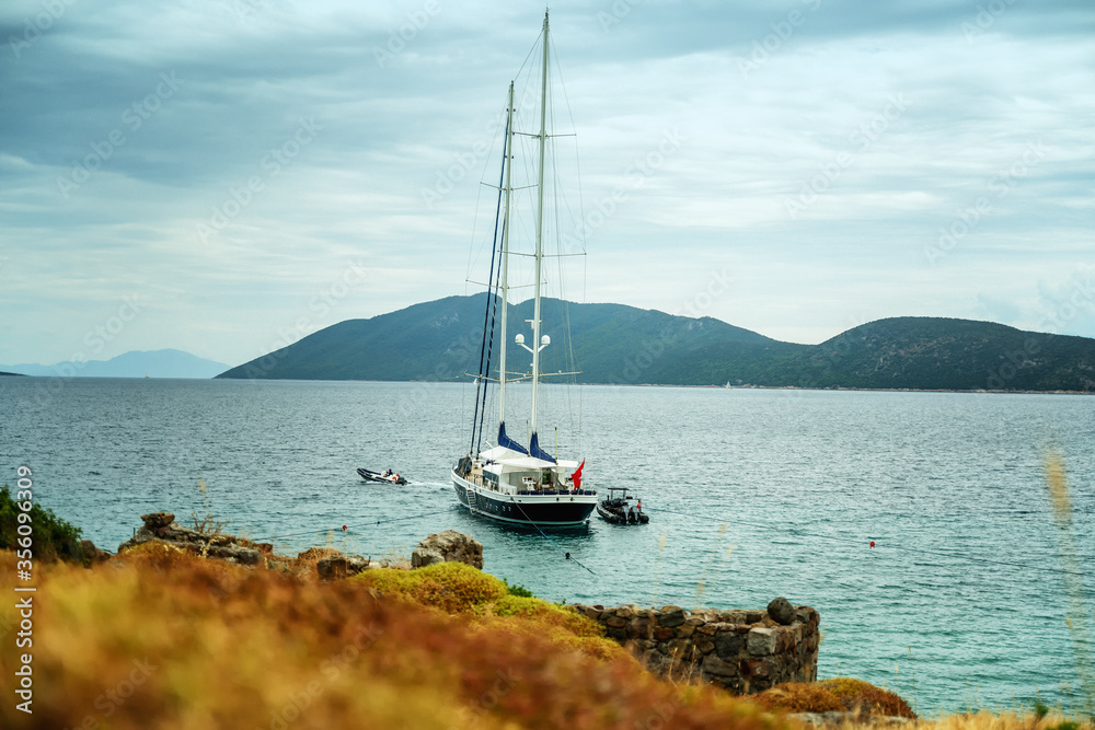 Beautiful seascape, a luxury yacht on the sea shore. Retro tone image