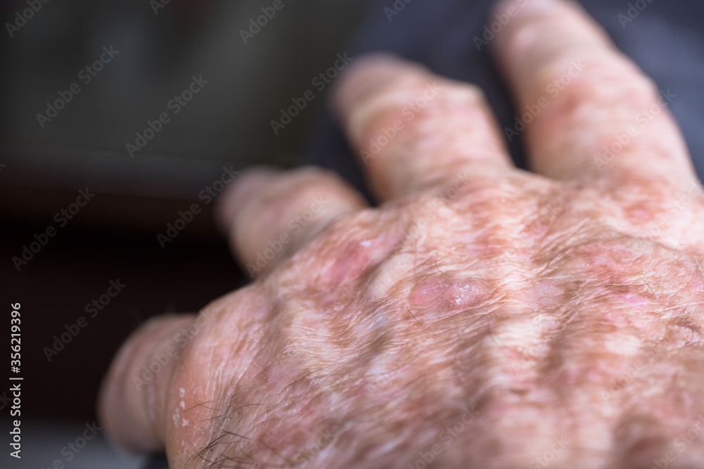 Lesions of actinic keratosis or sunspots on sun-damaged skin of the hand of a man. This can be treated with cryosurgery or certain ointments