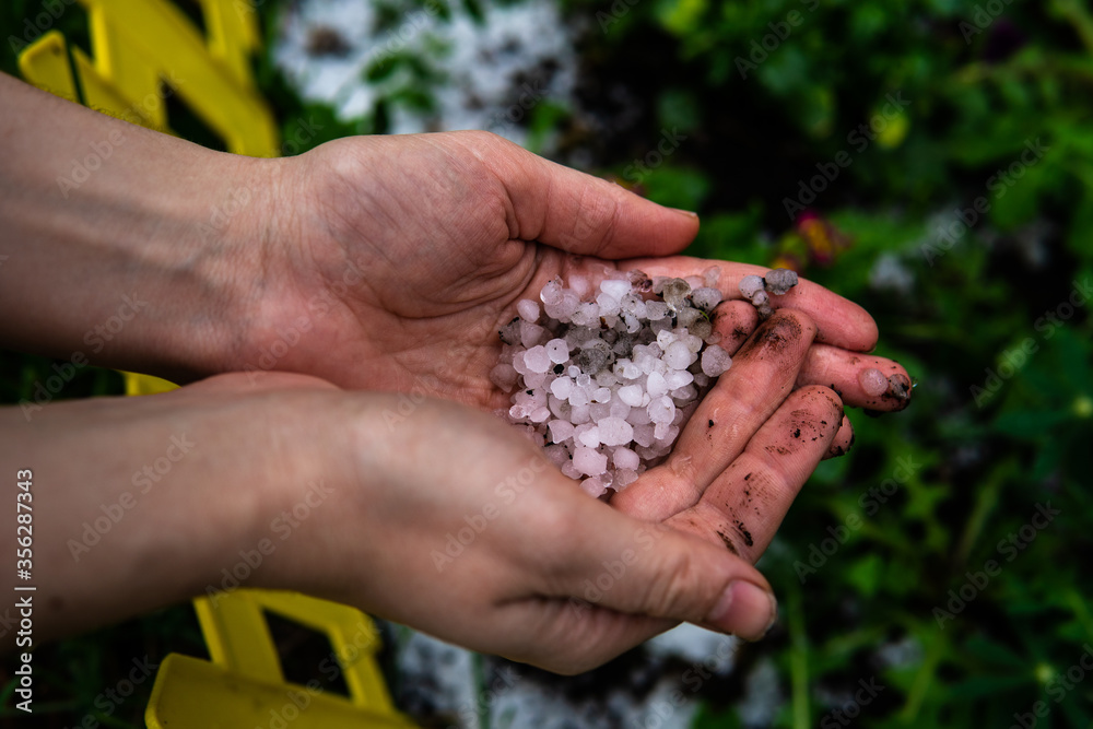Round pieces of white hail in women's palms