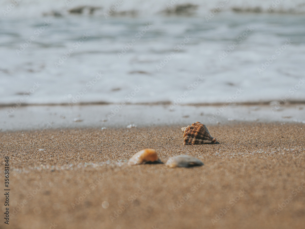 Beautiful Seashells In The Sand On The Sea Coast Or Ocean. Sea Foam On Sea Shells. Summer Concept. Wallpaper. High Quality