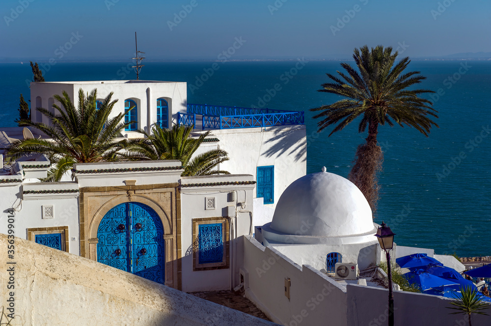 Tunisia. Sidi Bou Said. View of the Gulf of Tunis and the famous Coffee "Sidi Chebaane"