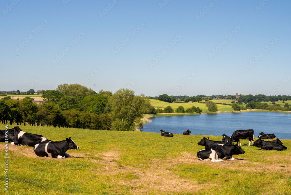 Black and white cows taking a rest on a very warm spring day at Pickmere, Knutsford, Cheshire, UK