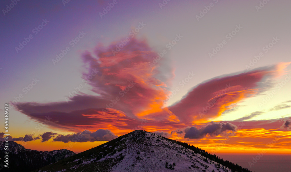 Amazing angel looking cloud formed during winter sunset above Zavizan on the Velebit mountain, Croatia