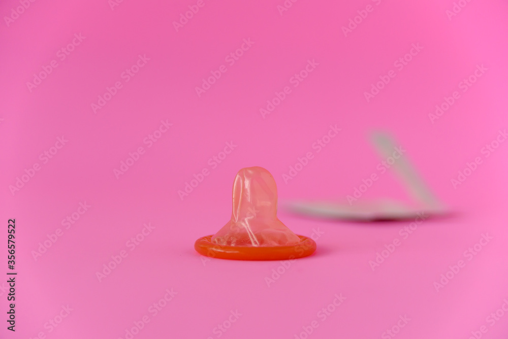 opened red condom with condom pack on pink paper background with copy space for text. Reproductive health, contraception and safe sex concept