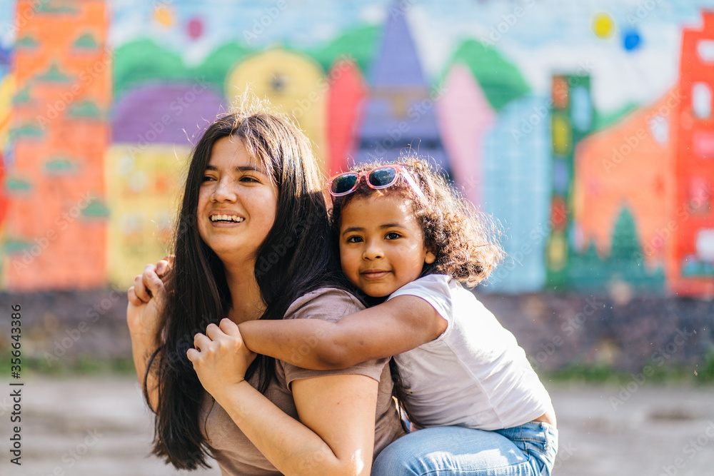 Mixed race laughing ecuadorian mother playing and carrying young preschooler dark-skinned daughter on her shoulders while walking together in playground. Blurred children s drawing on background.