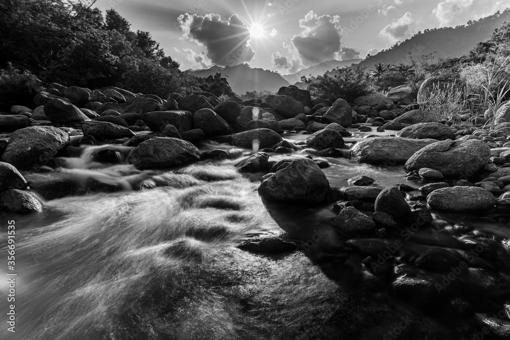 River stone and tree with sun beam, Stone river and sun ray in forest, Black and white and monochrome style
