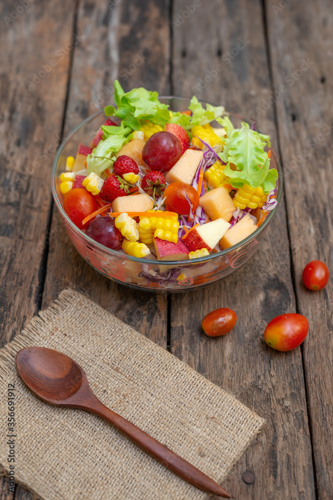 Fruits salad and vegetable in dish plate on gray