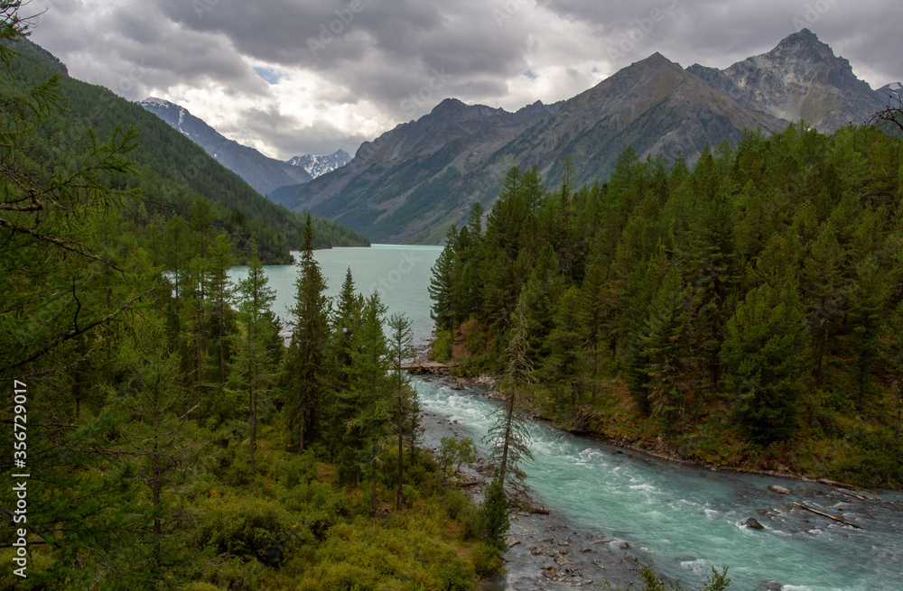 Stormy, mountain river in Altai, on the background of mountain peaks with dense vegetation along the banks