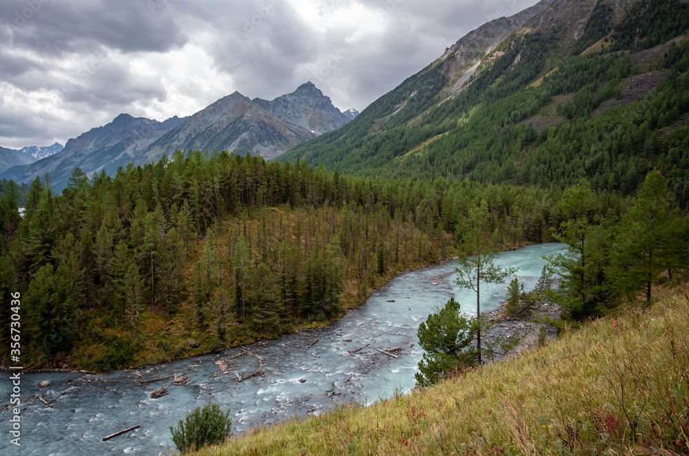 Stormy, mountain river in Altai, on the background of mountain peaks with dense vegetation along the banks