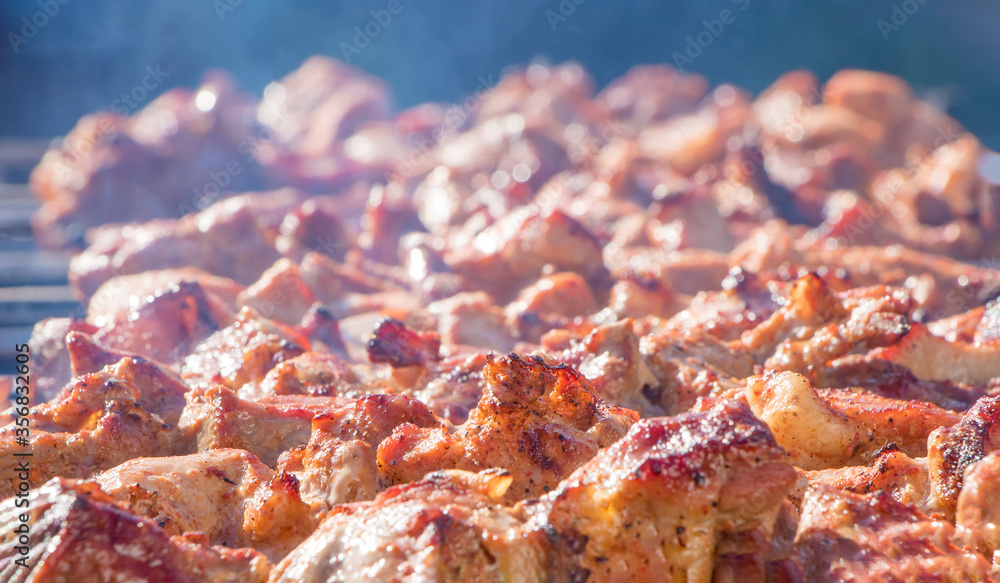We fry shish kebabs, barbecue, BBQ in the backyard in the summer on a weekend. The chef prepares meat in a cafe or restaurant. Fresh raw and fried pork, beef and lamb meat on a skewer.