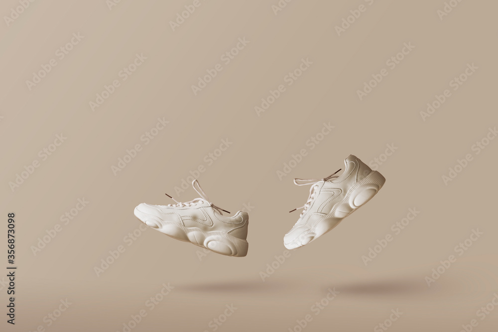 Modern women's sneakers of light color flying on a beige background. Stylish fashionable minimalism, concept levitation shoes, creative layout with copy space for text.