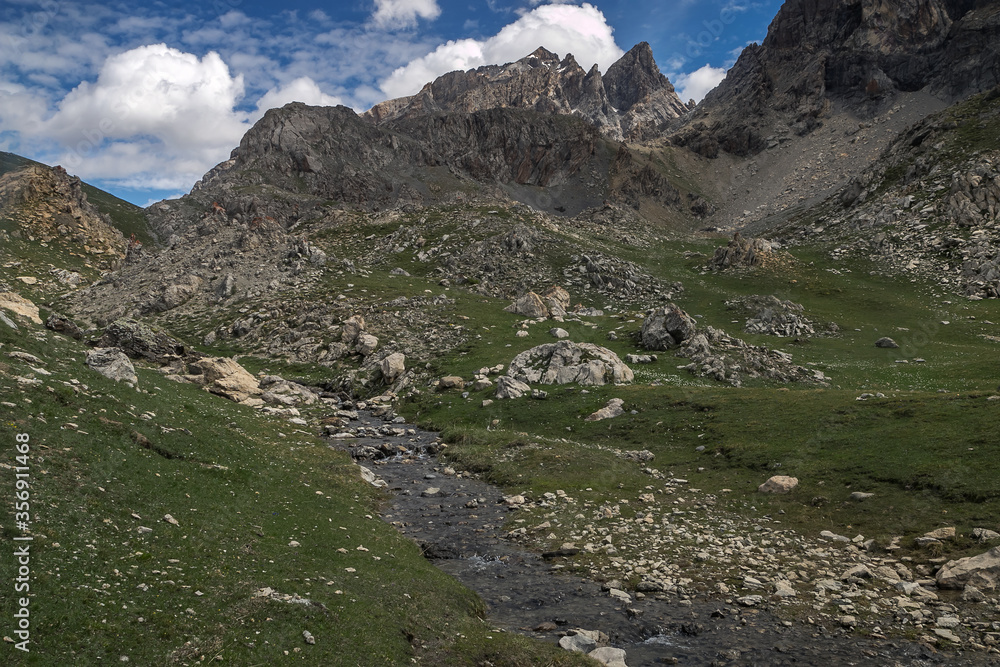 Paysage de Haute Ubaye , torrent et sommet du Massour , Fouillouse , Alpes de Haute Provence
