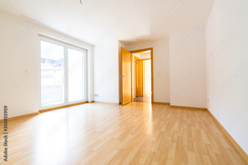 low angle vertical view of new wooden parquet flooring in a bright light and white apartment room