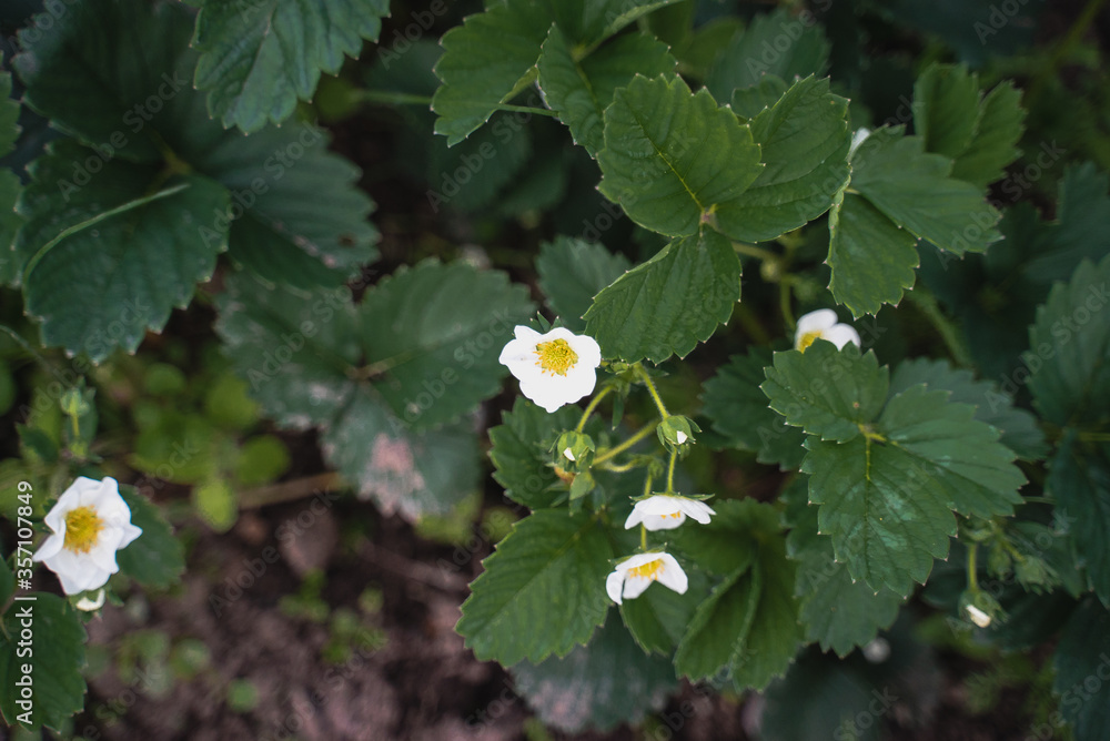 Organic Health Food. Blooming strawberries in the garden. Homemade super food.