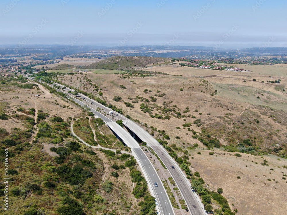 Aerial view of road bridge, viaduct supports in the valley among the dry yelllow hills, transport infrastructure. California, USA