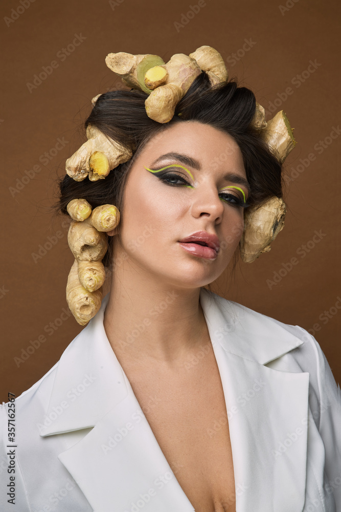 A close-up portrait of a brunette girl with ginger in her hair. Ginger is like a curler.