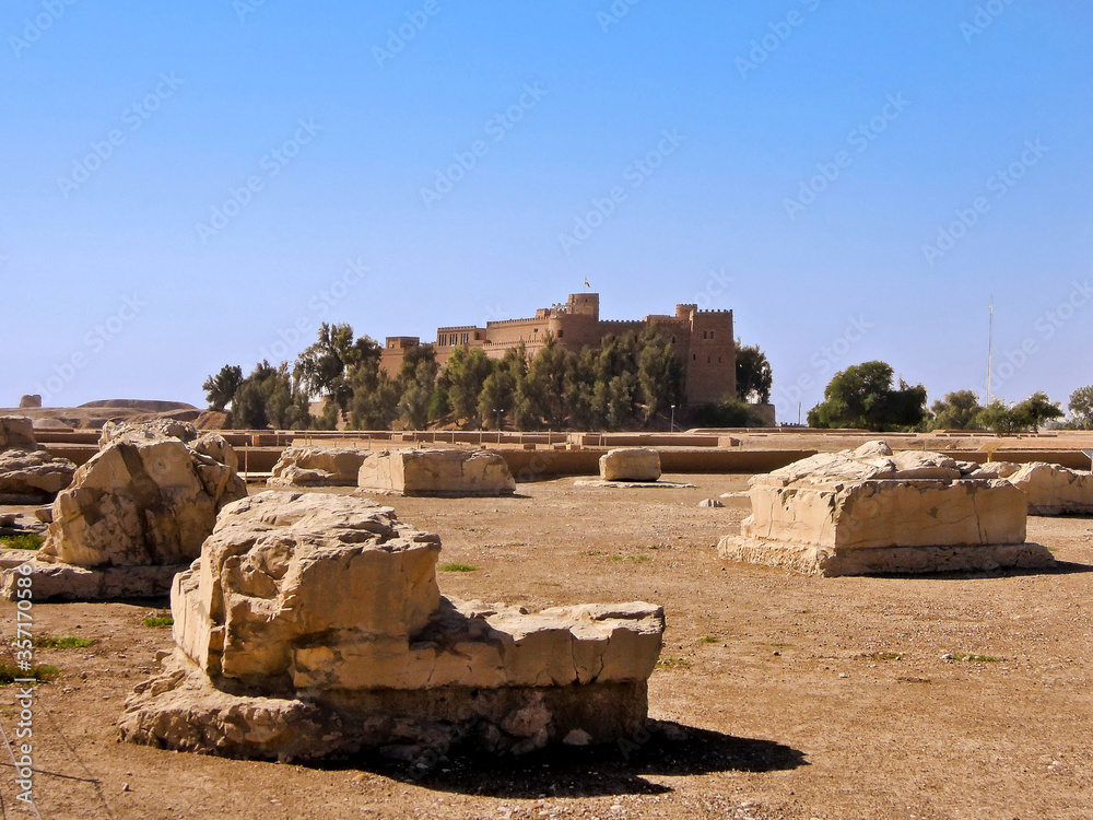 Panoramic view onto remains of King Darius Palace in Susa, & fortress of Frech archeologists. Ruins of Susa included in UNESCO Heritage List. Former fortress using as museum of ancient Persian history