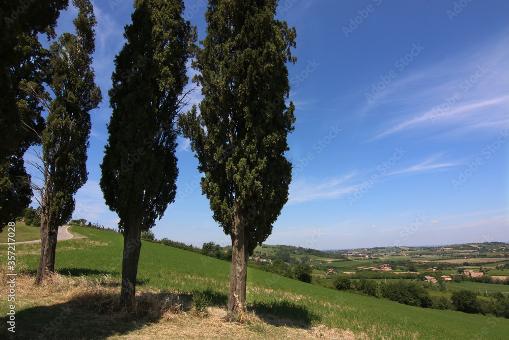 Cipressi in collina si stagliano sull’azzurro intenso del cielo in una giornata d’estate