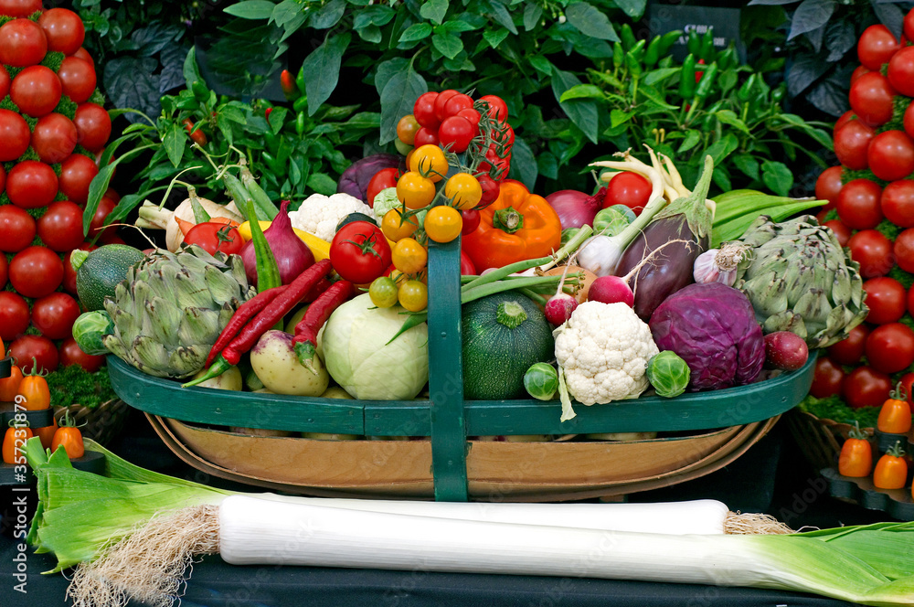 A trug full of a large colourful selecion of fresh vegetables from the garden