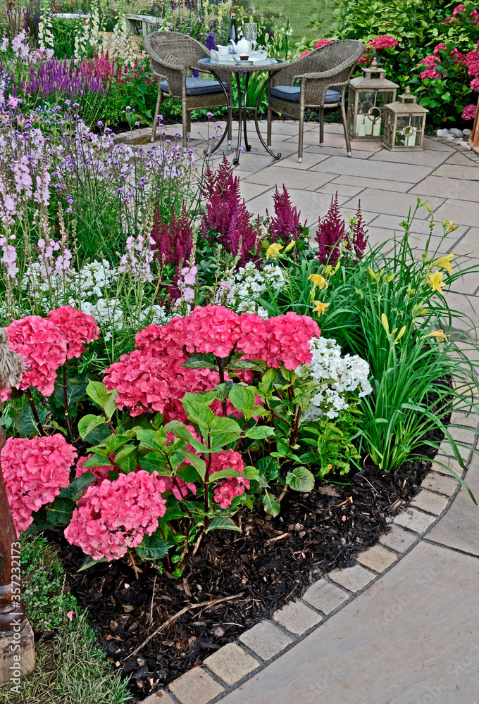 The patio area in a terrace garden with colourful planted border and outdoor eating