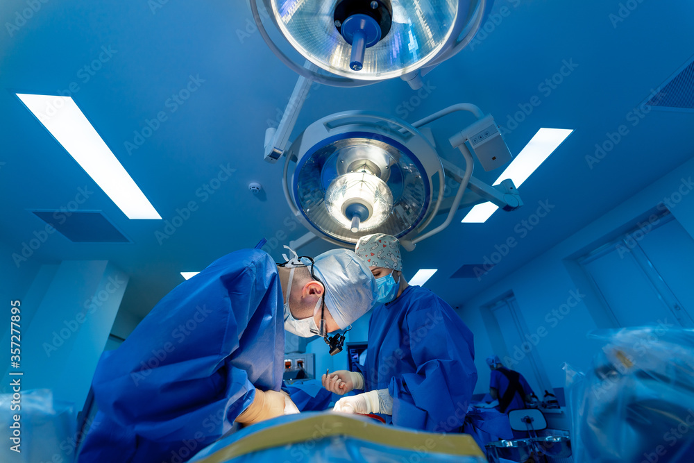 Surgical room in hospital with robotic technology equipment, machine arm surgeon in futuristic operation room. Minimal invasive surgical innovation, medical robot surgery with endoscopy