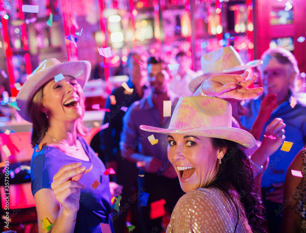 Confetti falling on women wearing cowboy hats laughing dancing in nightclub