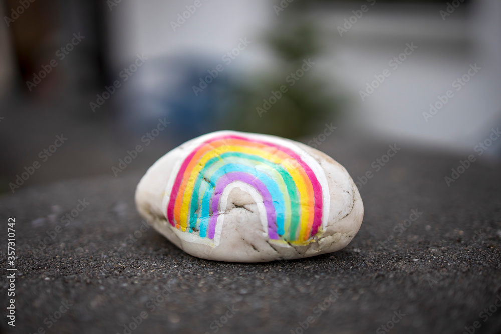A stone on which a child painted a rainbow. Stay at home during Corona