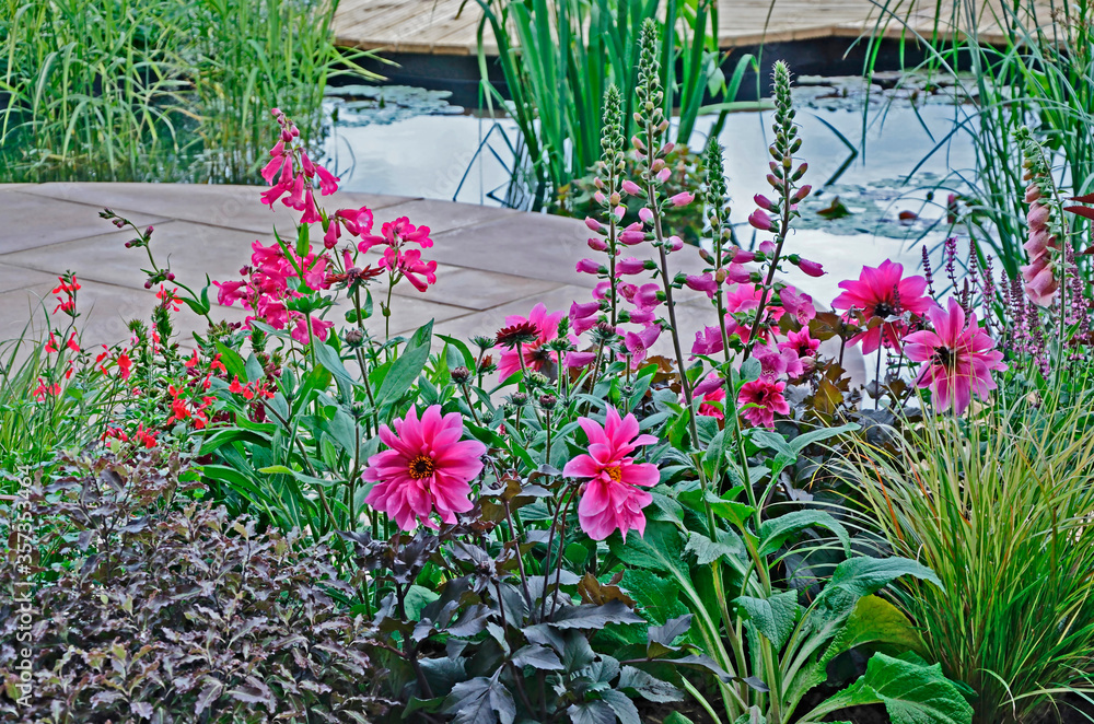 A colourful pink flower border with Foxgloves and Dahlia around a pond