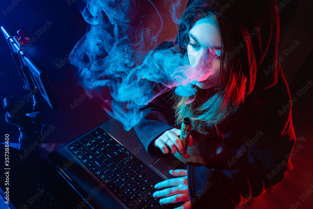 The girl smokes VAPE and uses computer gadgets. A girl on a dark background with an electronic cigarette in her hands. Hacker girl with an e-cigarette. Cybercrime.