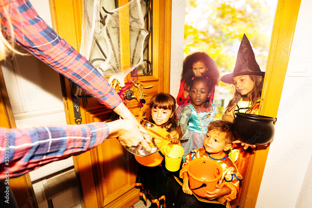 Large group of kids Halloween costumes stand in the door with orange buckets for candies receive sweets from adult