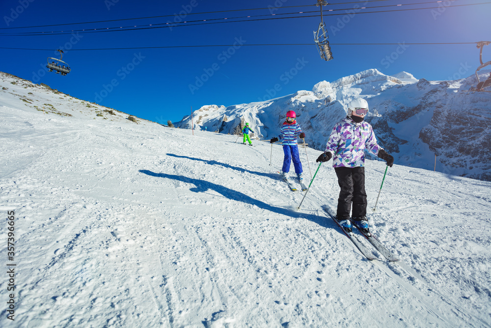 Three kids ski on the Alpine slope as part of the school group one after another with mountains and lift on background