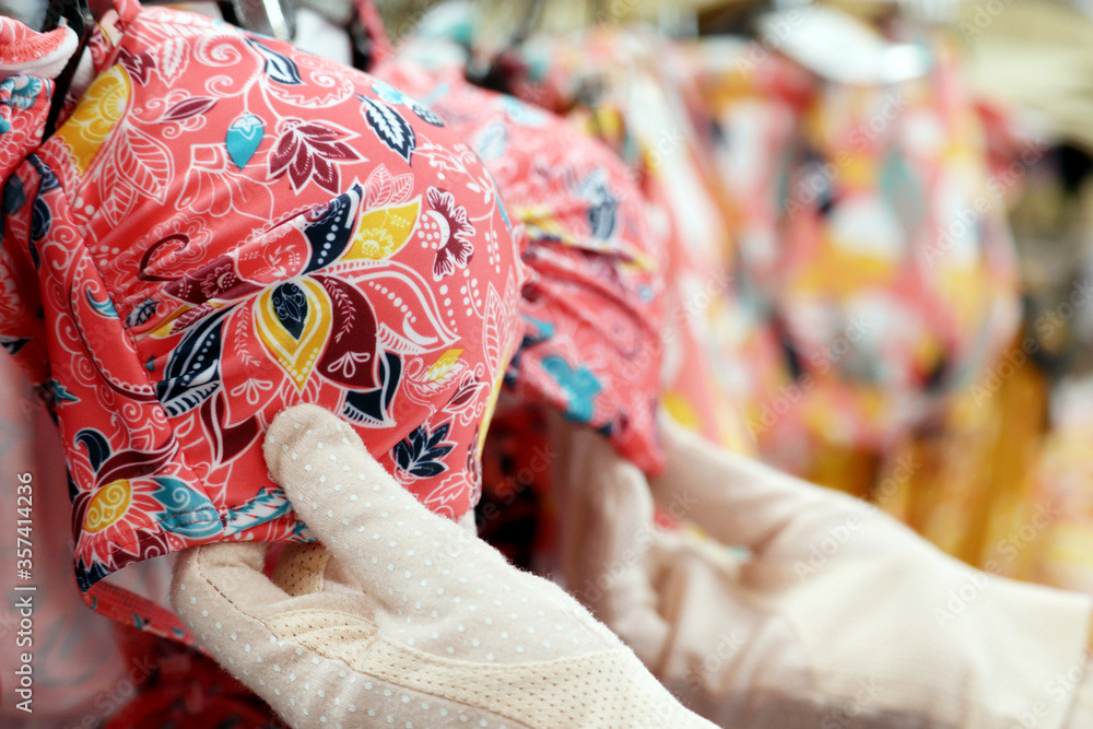 Woman in protective gloves chooses swimsuit hanging on rack in lingerie store. Concept of shopping, customer during sale, female fashion for summer vacation