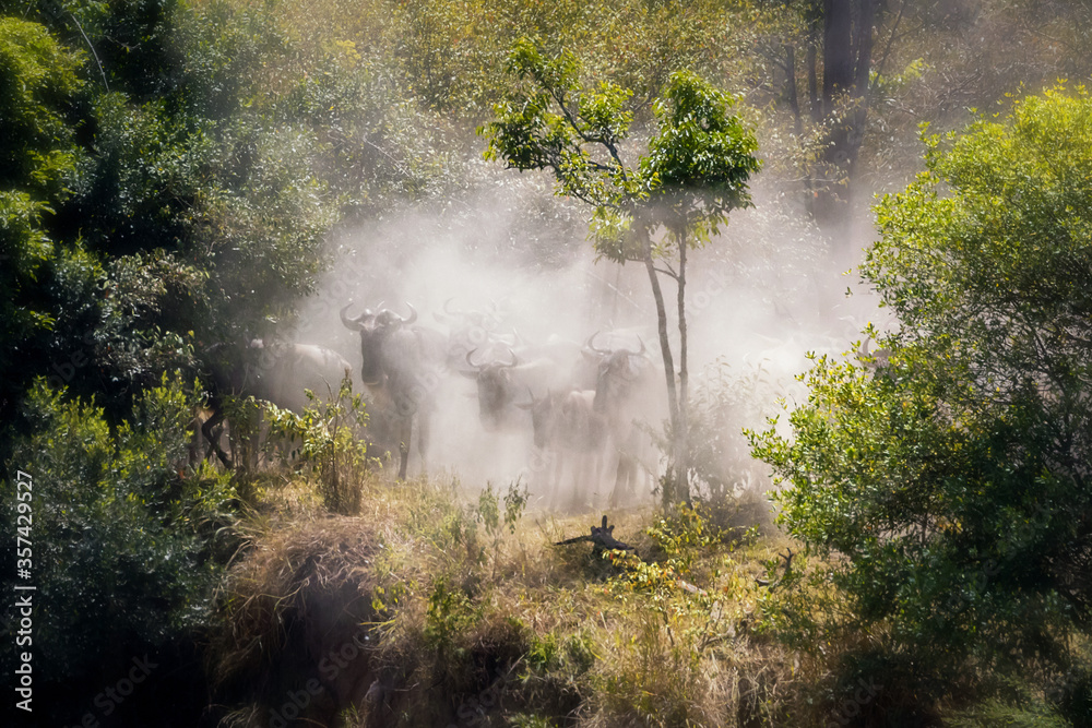 Wildebeest herd in a dust cloud on the banks of the Mara River, Kenya