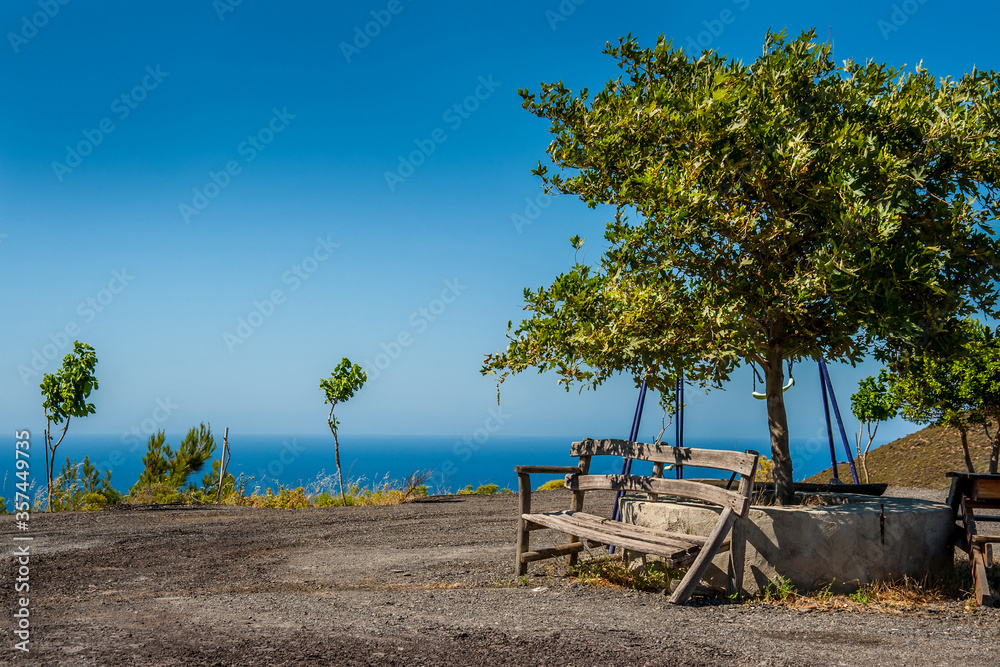 Bench near a plane tree on the seashore