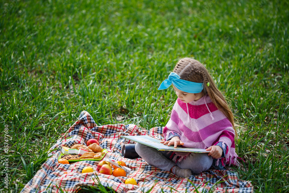 little girl child sits on a bedspread and reads a book with a fairy tale, green grass in the field, sunny spring weather, smile and joy of the child, blue sky with clouds