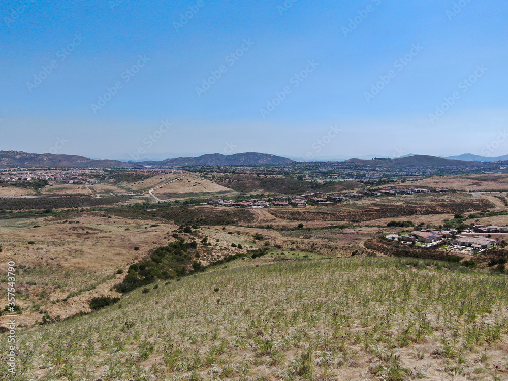 Aerial view of high class neighborhood with residential mansions and swimming pools in dry grass valley during hot summer. San Diego, California, USA.