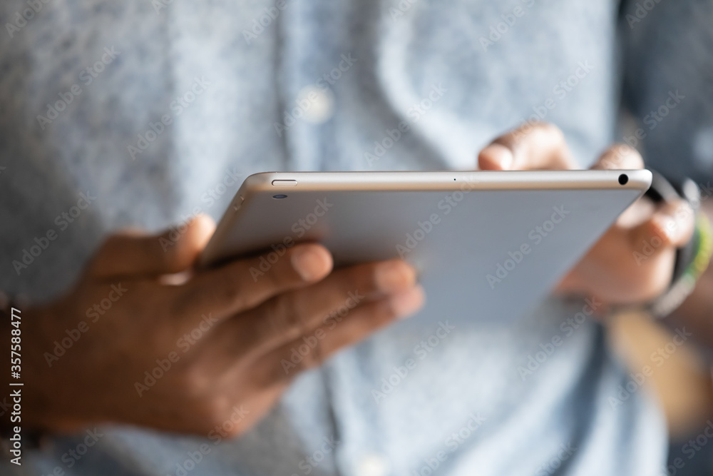 Close up hands African man holding digital tablet device. E-commerce websites buy in internet on-line stores usage, typing e-mail to client, reading sending message to friends, e-date website concept