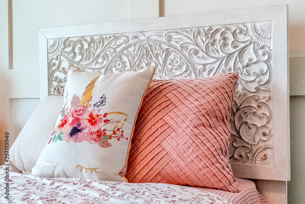 Fluffy pillows against decorative headboard of single bed against panelled wall