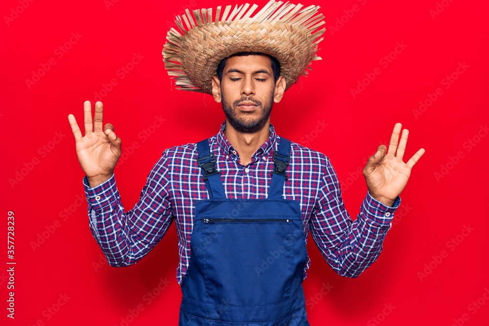 Young latin man wearing farmer hat and apron relax and smiling with eyes closed doing meditation gesture with fingers. yoga concept.